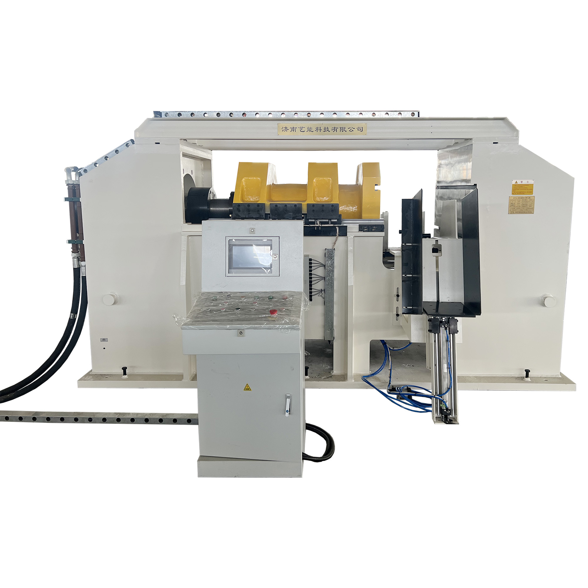 该机用于对焊缝处理后的工件两端进行扩口,由床身、主滑板、滑板油缸、直线导轨、自动上下料机构、模具、电控系统及液压系统等部分组成。滑板采用直线导轨结构,确保运动精度与稳定性。工作压力、工作速度及行程范围等可根据工艺需要灵活调节,支持手动和自动两种操作方式。设备结构布局紧凑合理、对中性能优异、操作便捷,可高效完成轮辋加工中的上料-扩口-出料全流程自动化作业。