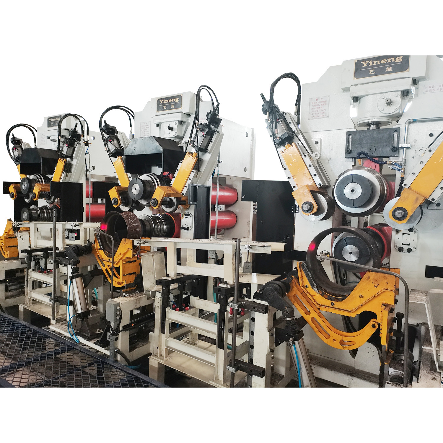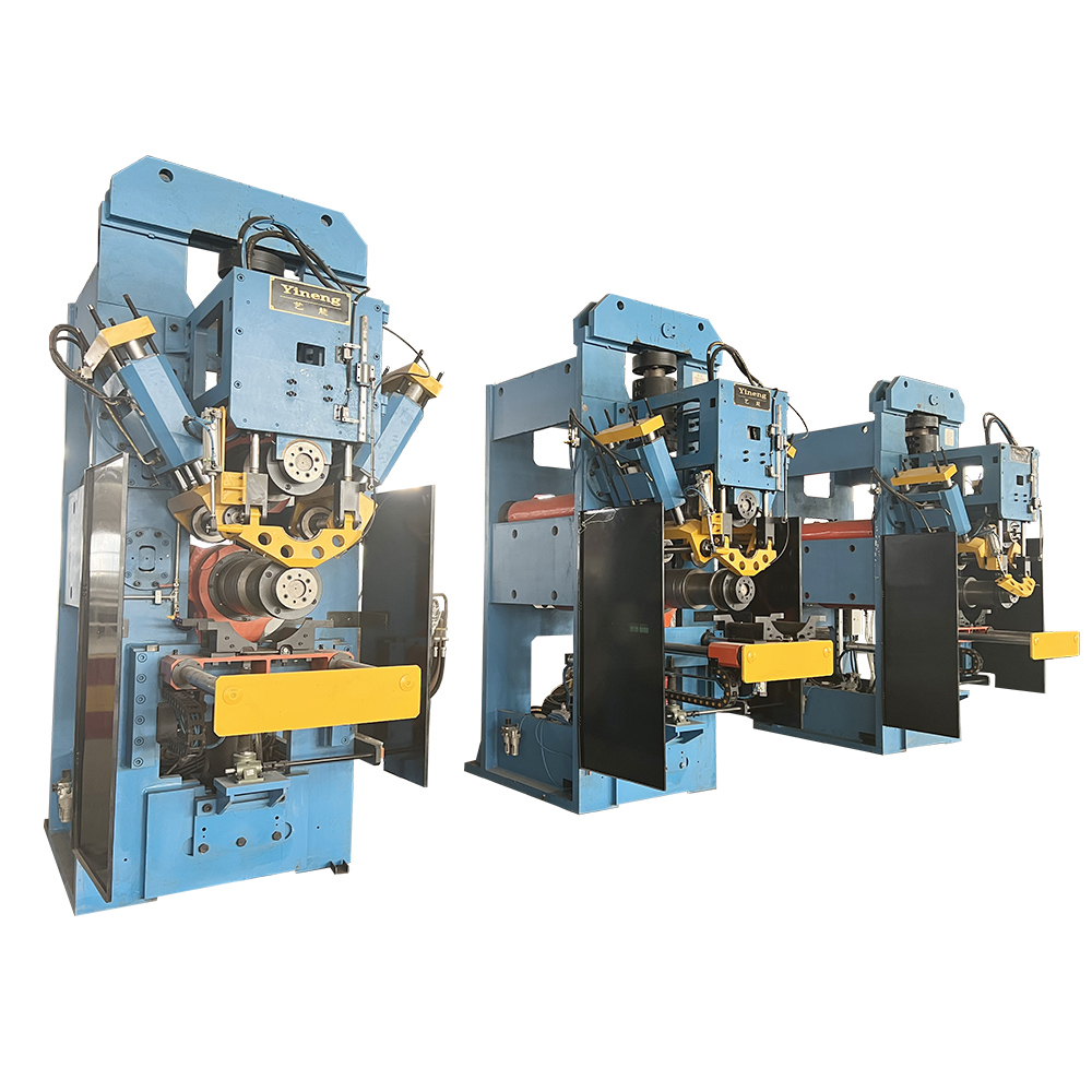 滚型机共三台,对应扩口后工件的三道滚压成型工序。设备由机身、上下臂及主轴、侧导向装置、驱动装置、液压系统、润滑系统、辊道和自动上下料装置组成。